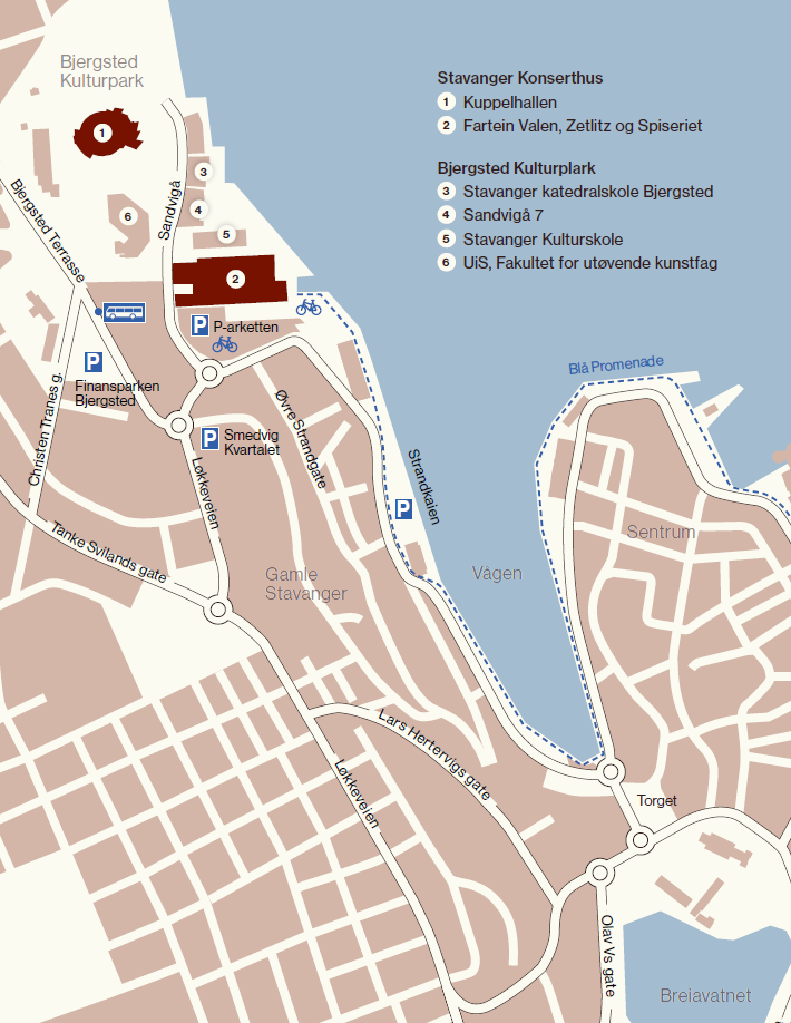Stavanger konserthus ligger ved sjøen i Sandvigå, 700 meter nord-vest for Torget. Kuppelhallen (det gamle konserthuset) ligger i Bjergstedparken like ved. Det er en fin spaser- eller sykkeltur til konserthusene langs Blå Promenade eller gjennom Gamle Stavanger.